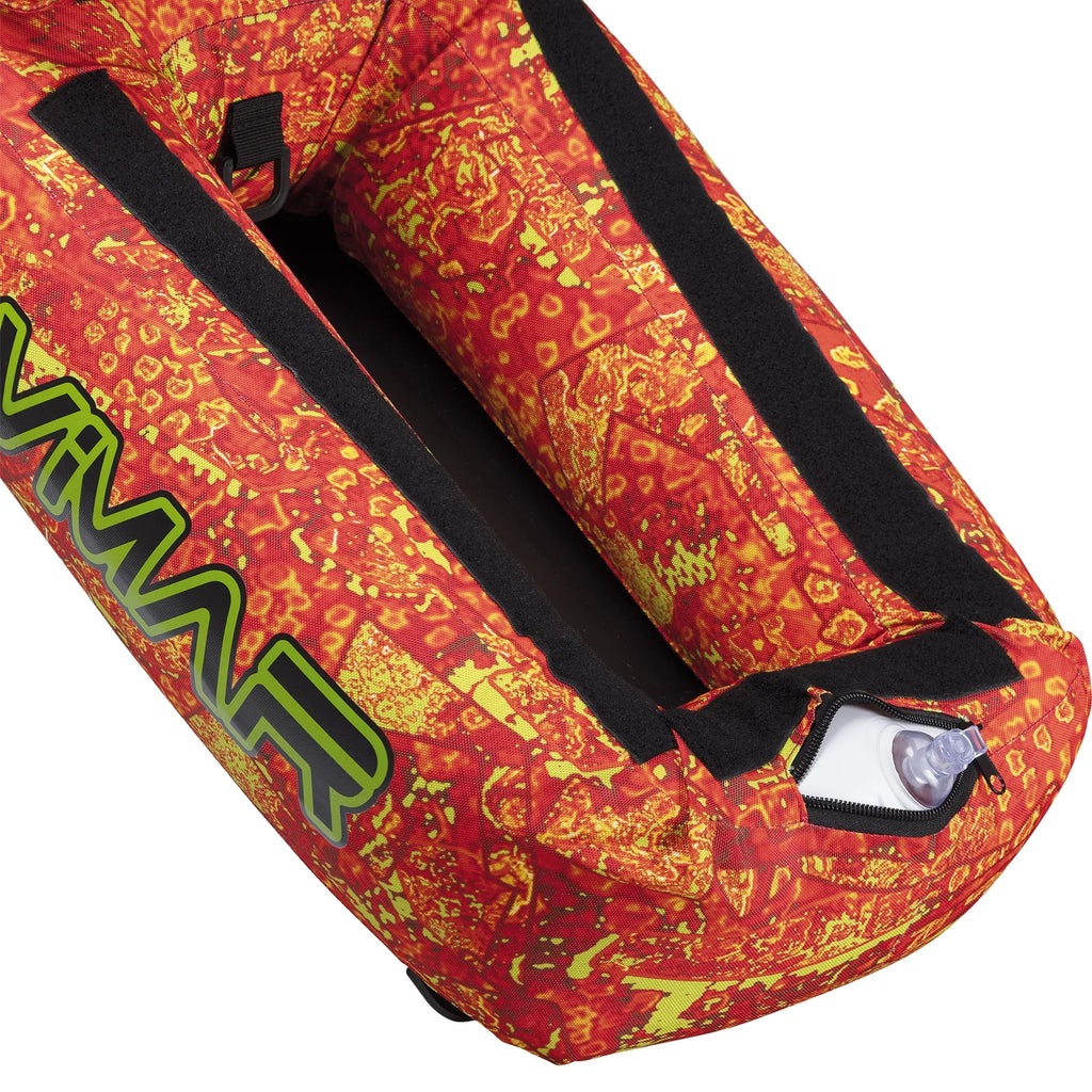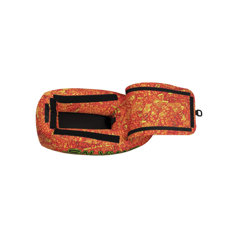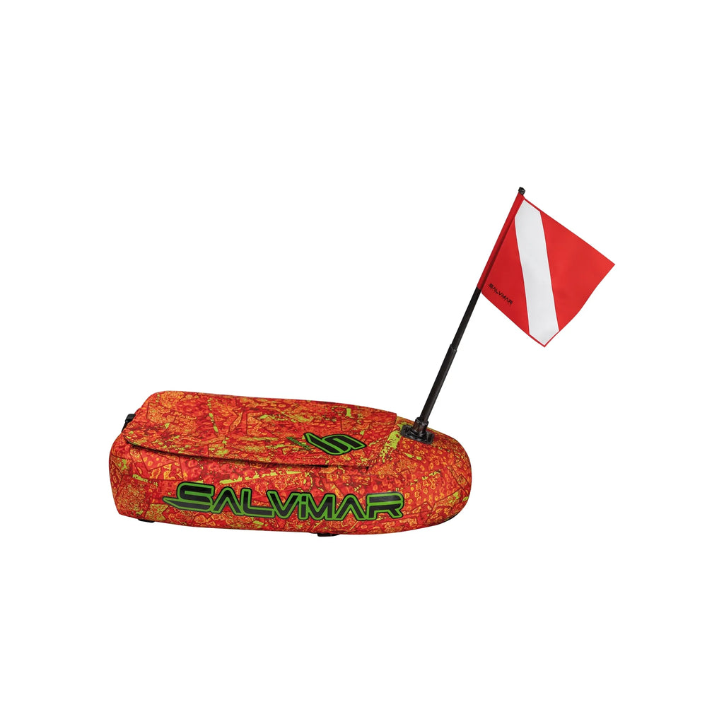 The inflatable dive board is designed with a PVC inner chamber and a durable outer lining of high-strength nylon fabric, which offers optimal protection against abrasion. Its high-visibility color conforms to safety regulations, ensuring easy spotting in the water. The size of the dive board is calibrated to provide a buoyancy thrust of 40 kg, making it suitable for carrying equipment and materials while diving. It has a Velcro-closed storage compartment for securing accessories during transport. The Shaft of the flag is oversized and reinforced to ensure optimal visibility, while the included flag complies with standard dimensions. The dive board has stitched cordura bands for fixing arbalete, pneumatic guns and other items needed during diving activities. It also comes with a 25-meter floating rope.