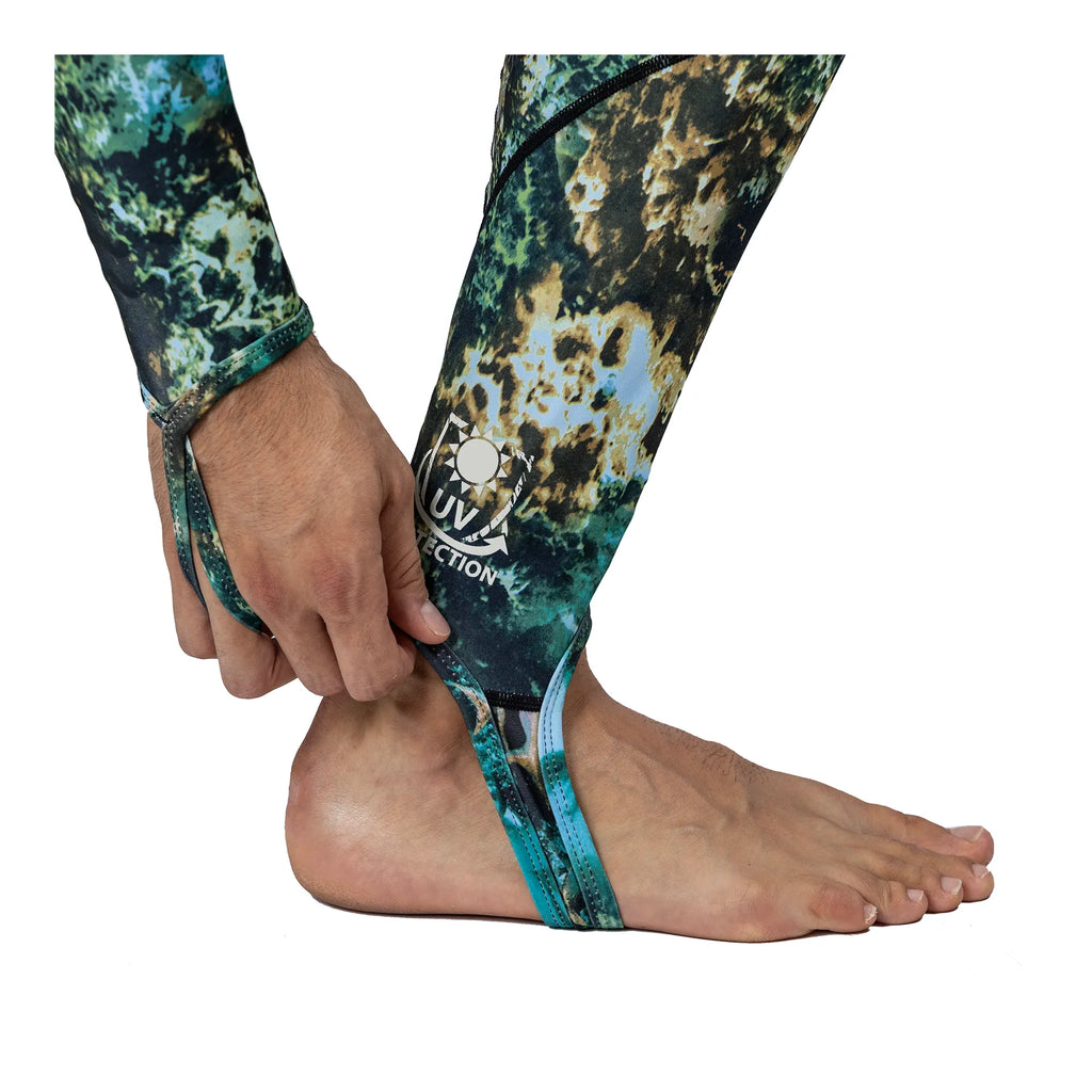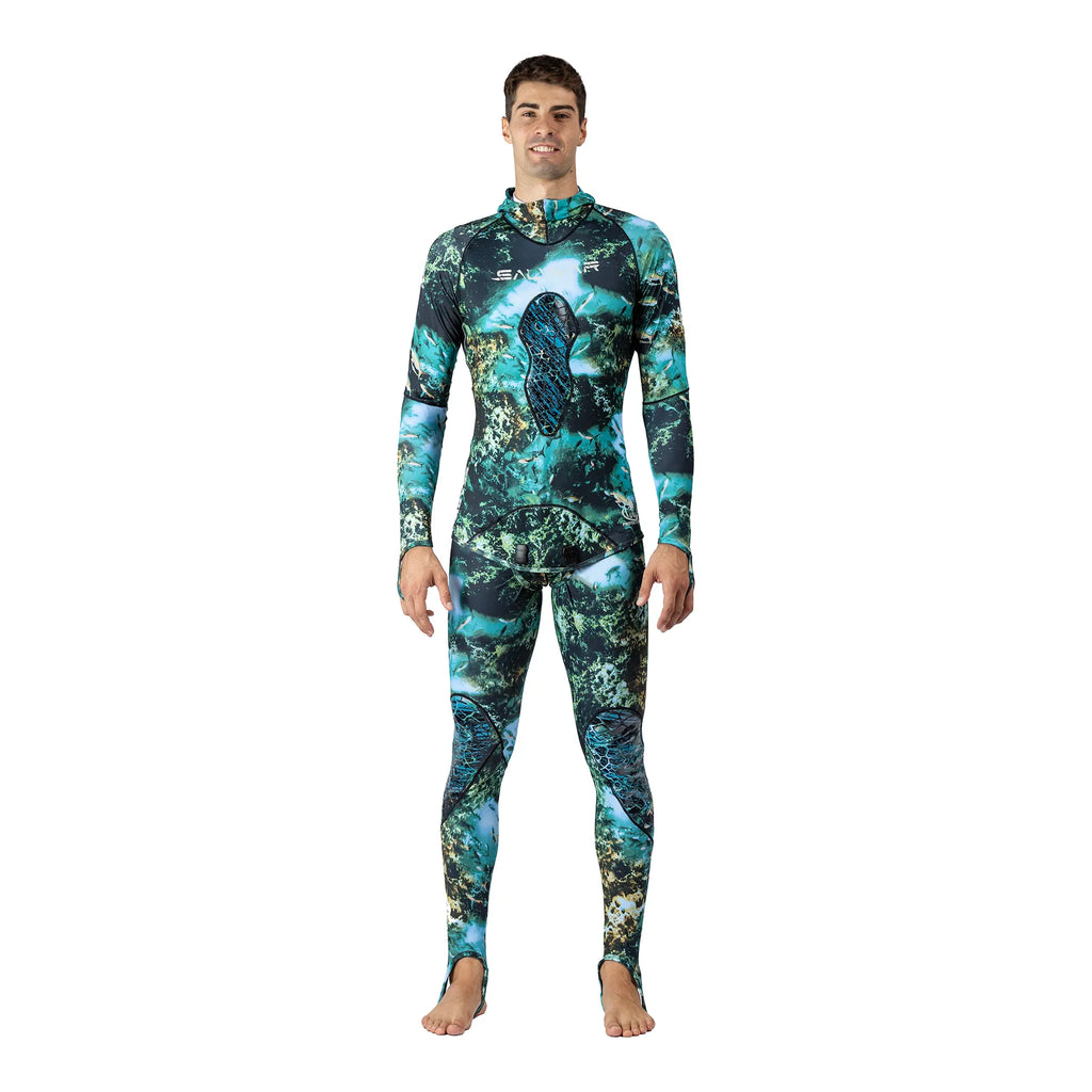 The two-piece hooded Rash Guard is designed for temperate waters, offering protection and comfort while diving. Made of 230 g super elastic material, it provides freedom of movement and adherence to the body. The textured Salvimar Camo lining adds a touch of style and functionality. Adjustable button closure ensures secure, snug dressing. Flat-lock seams ensure strength and durability. This Rash Guard offers reliable protection against UV rays and animals while providing additional sternal support. The fixing insole ensures that the Rash Guard stays in place during diving activities.